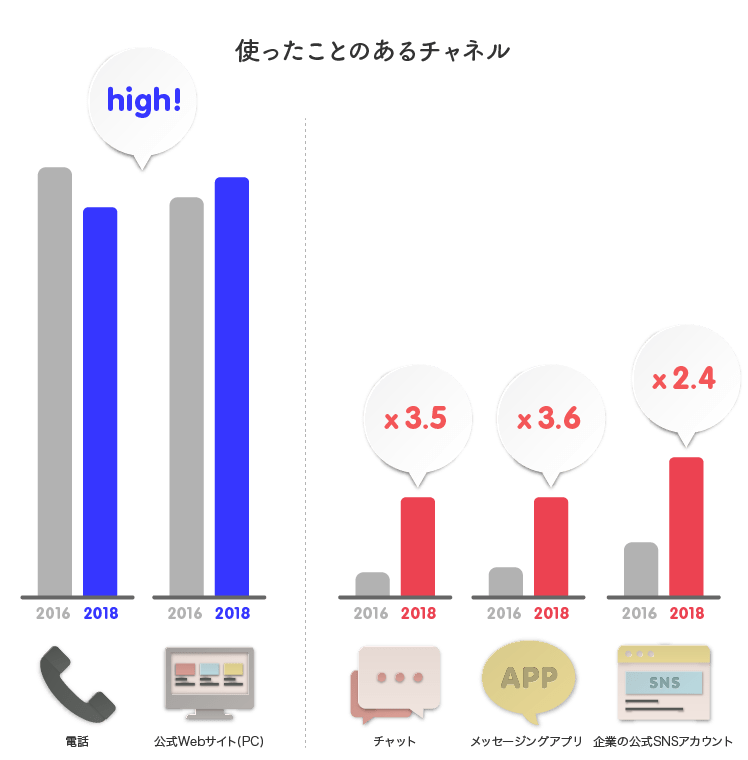 「電話」「公式Webサイト(PC・スマホ)」「店舗・店頭」などがいわば”王道チャネル”として使われています。