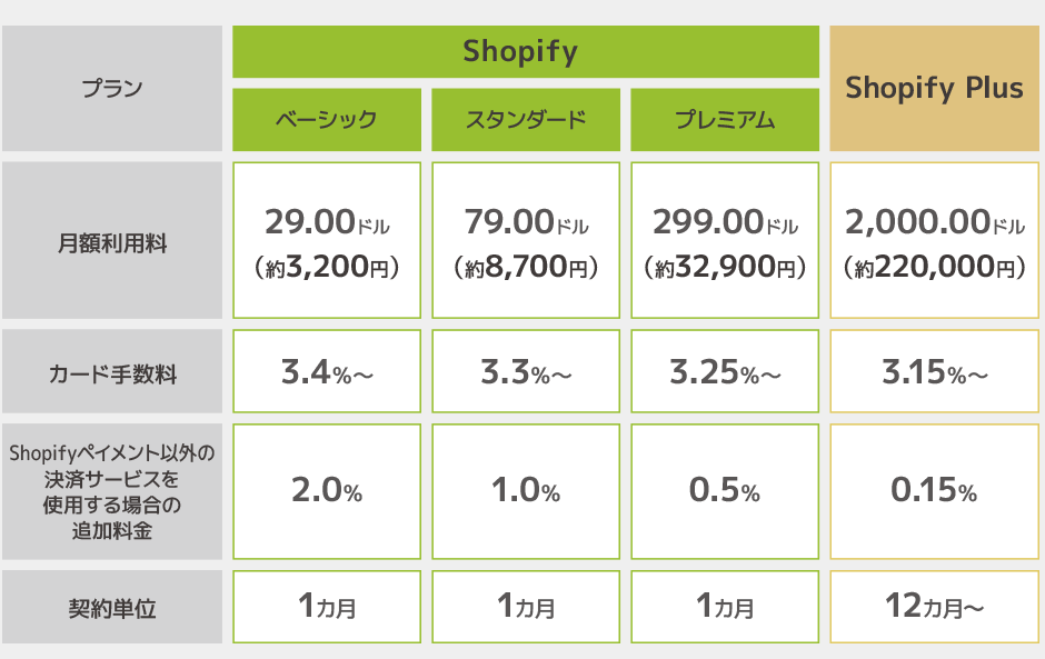 上記費用はShopifyを利用する場合Shopify社に支払う必要があるシステム利用料及び決済に係る手数料の一覧です。サイト制作費用については、機能やデザイン、ページ数などの要件次第で変わる為、まずはお問い合わせくださいませ。